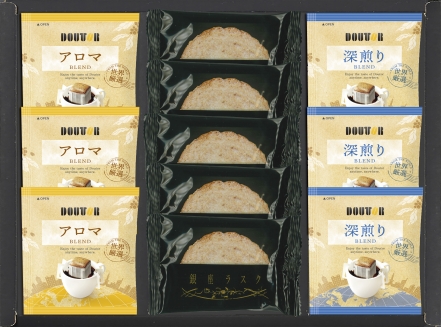 トップページ > 商品紹介 > ラスクセット > 銀座ラスク・ドトールコーヒーギフトセット RSK-BE 【税込¥2,700】 銀座ラスク・ドトールコーヒーギフトセット ¥2,500(税抜) シナモン&アップルが香るサクサクの銀座ラスクとドトールのドリップコーヒーのセットです。 銀座ラスク(シナモンアップル)5枚、 ドトールドリップコーヒーアロマブレンド7g×3袋、 ドトールドリップコーヒー深煎りブレンド7g×3袋 箱サイズ/260×350×43 mm 梱/20