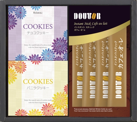 トップページ > 商品紹介 > クッキーセット・スープセット・おすすめ商品 > ドトールコーヒーギフトセット MEM-BOA 【税込¥2,160】 ドトールコーヒーギフトセット ¥2,000(税抜) お湯を注ぐだけで手軽に作れるドトールコーヒーのカフェオレスティックとクッキーのセットです。 ドトールカフェ・オ・レ9.5g×4本、 チョコクッキー50g、バニラクッキー50g 箱サイズ/203×225×60mm 梱/30